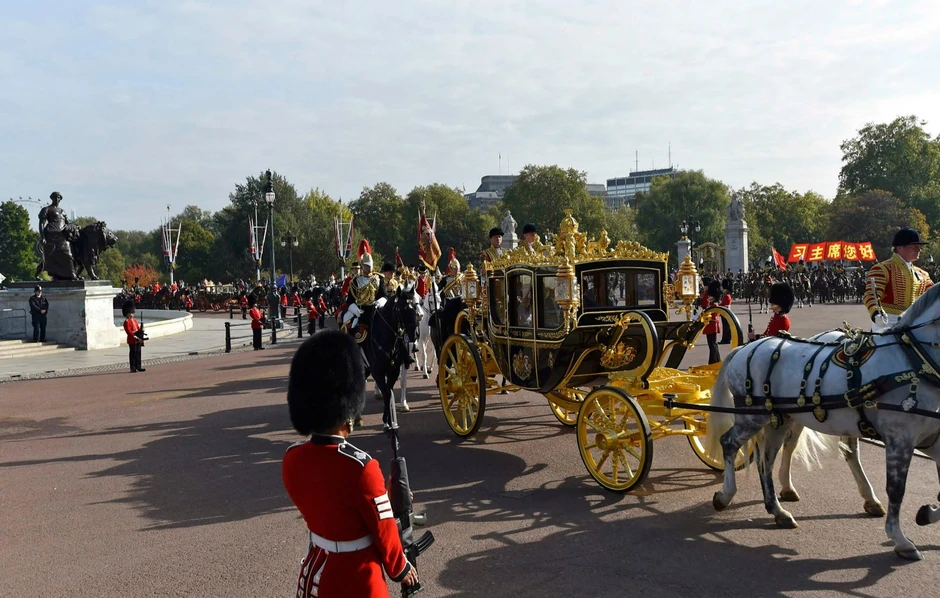 Kineski predsednik Si Djinping stigao je danas u Bakingemsku palatu u kraljevskom stilu - u zlatnoj kočiji koju su vukli beli konji.
