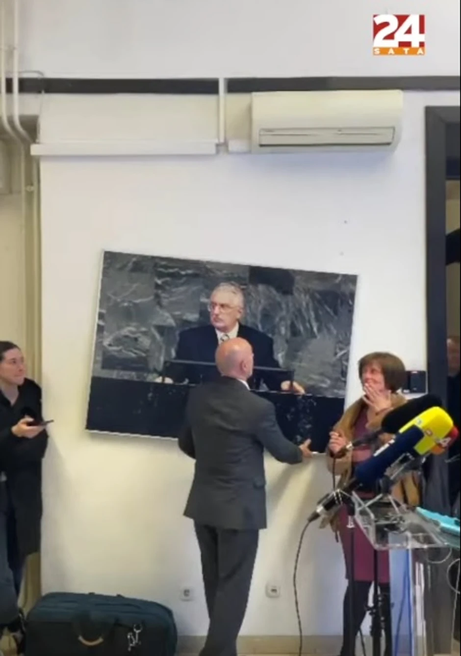 Na ogromnoj slici koja je pala na pod, Tuđman je fotografisan za govornicom UN, a ljudi iz HDZ odmah su priskočili i vratili je na zid.