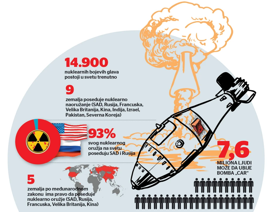 Dve države koje daleko iznad svih odskaču u količini nuklearnog oružja koje poseduju jesu Rusija i SAD, sa neverovatnih 88 procenata svog nuklearnog naoružanja na svetu. Ako tu uvrstimo i nuklearne bojeve glave koje nisu spremne za upotrebu, brojka raste na zastrašujućih 93%.