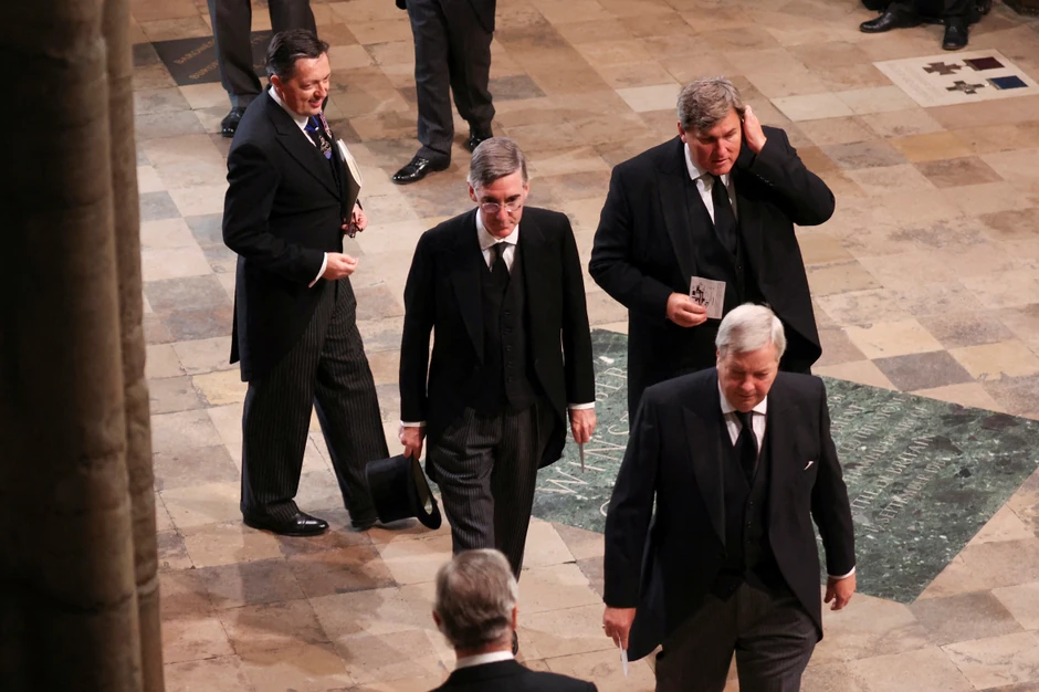 Vojvoda od Jorka Endrju i vojvoda od Saseksa Hari, koji više nisu članovi kraljevske porodice, obojica nose formalna odela dok prate kraljičin kovčeg niz Vestminstersku opatiju.