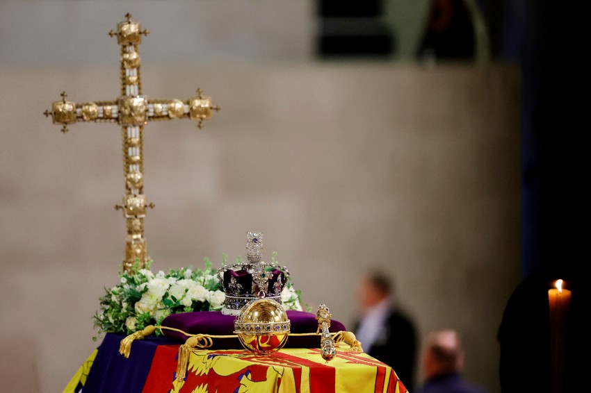 Carska državna kruna, kugla i žezlo koji se nalaze na kraljičinom kovčegu, i stoje otkako je prošle nedelje donet u Vestminster, uklonjeni su. Predmeti su predani dekanu od Vindzora i on ih stavlja na veliki oltar.