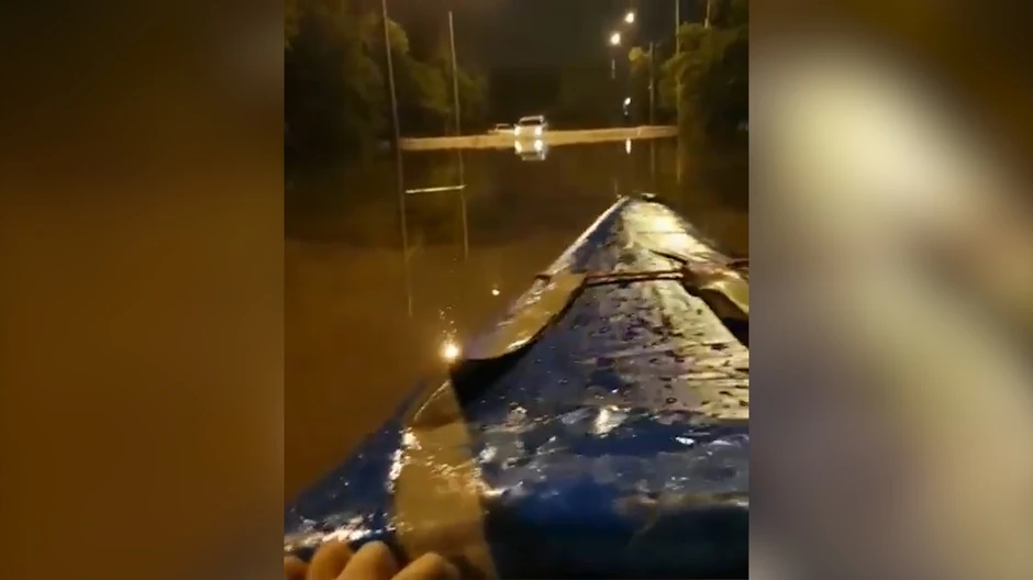 Ovi Rusi su se lepo snašli. Dok su se neki mučili da kolima pređu poplavljenu ulicu, oni su seli u kajak i zaveslali preko "reke".