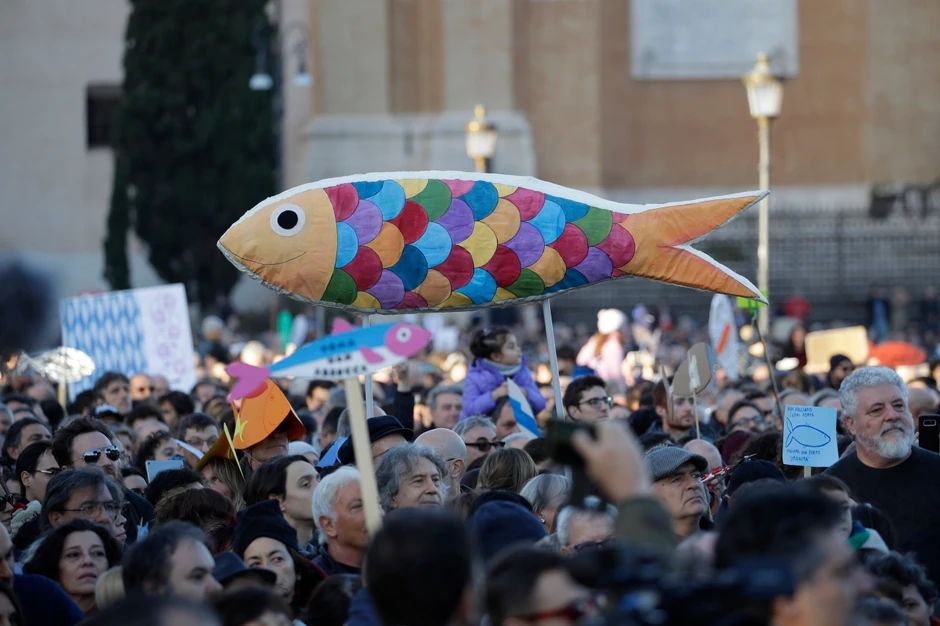 Na rimskom Trgu San Đovani, poput pravih sardina, sjatilo se više od 40.000 protestanata koji su uglas pevali antifašističku himnu "Bela ćao". Vođe pokreta su se nadale da će supiti 6.000 pristalica, ali se ispostavilo da su tu brojku višestruko premašili.