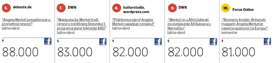 "Merkel je ludača - Kanadska televizija prikazala je dokaze", lažna je vest s trećim najvećim odekom, a objavio ju je kanadski ekstremno desničarki portal "HE RO". Dva od deset najdeljenijih članaka o Merkel na Fejsbuku su lični stavovi, odnosno komentari.