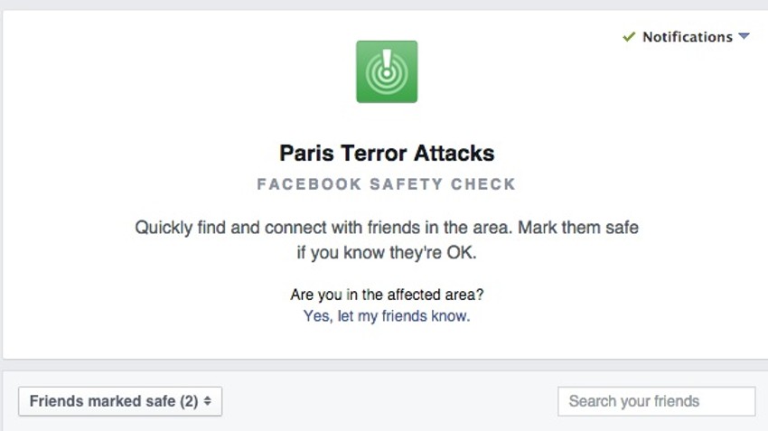 U satima nakon najnovijeg talasa nasilja u Parizu mnogi su se pitali da li su im prijatelji i porodica povređeni u napadima. Hiljade ljudi pokušavali su da to saznaju na Fejsbuku. Parižani su koristili opciju “safety check” (provera bezbednosti) da bi obavestili ostale da su bezbedni. Korisnici koji imaju prijatelje u Parizu obavešteni su o njihovom statusu zelenim znakom za štrikliranje.