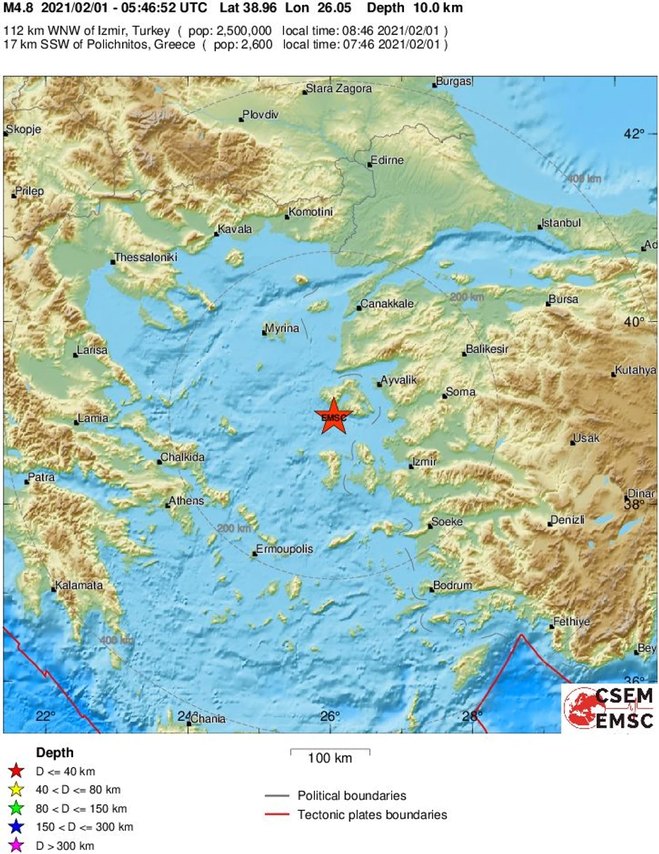 Kako je javio dopisnik makedonske agencije MIA iz Atine, za sat ipo vremena na moru, 46 kilometara jugozapadno od Lezbosa, registrovano je šest zemljotresa jačine između 2,9 i 4,9 stepeni.