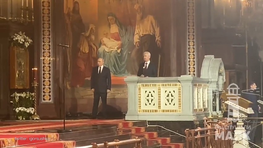 Potom je krupan kadar sa liturgije pokazao da Putina zapravo i nema na mestu gde je na snimcima zvaničnog Kremlja stajao tokom službe, da bi objašnjenje stiglo nakon objavljivanja nezvaničnog snimka na kojem se vidi kako Putin potpuno sam, bez naroda u blizini, samo u prisustvu gradonačelnika Moskve, stoji u hramu, pretpostavlja se, pre zvanične liturgije.