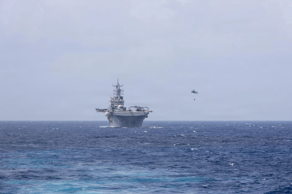 "USS Ivo Džima", amfibijski jurišni brod sposoban za pokretanje amfibijskih operacija, viđen je u pratnji još dva razarača, na udaljenosti od oko 20 kilometara.