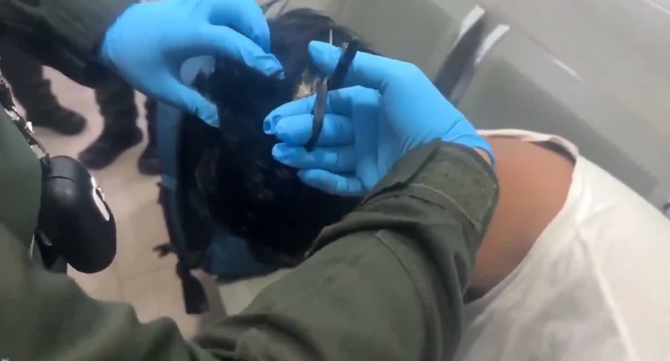 Video snimak hapšenja pokazuje policajce kako režu periku s glave, s nekoliko malih paketa kokaina koji se vide pričvršćeni na unutrašnjoj strani perike.