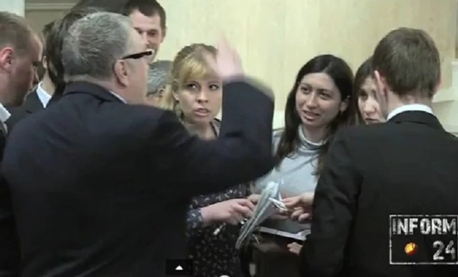 Dubovicakaja , novinarka televizije "Raša tudej", izazvala je bes Žirinovskog pitanjem u vezi sa sankcijama protiv Ukrajine. On je odmah krenuo da viče i usmerio dvojicu svojih mladih pomoćnika ka njoj.