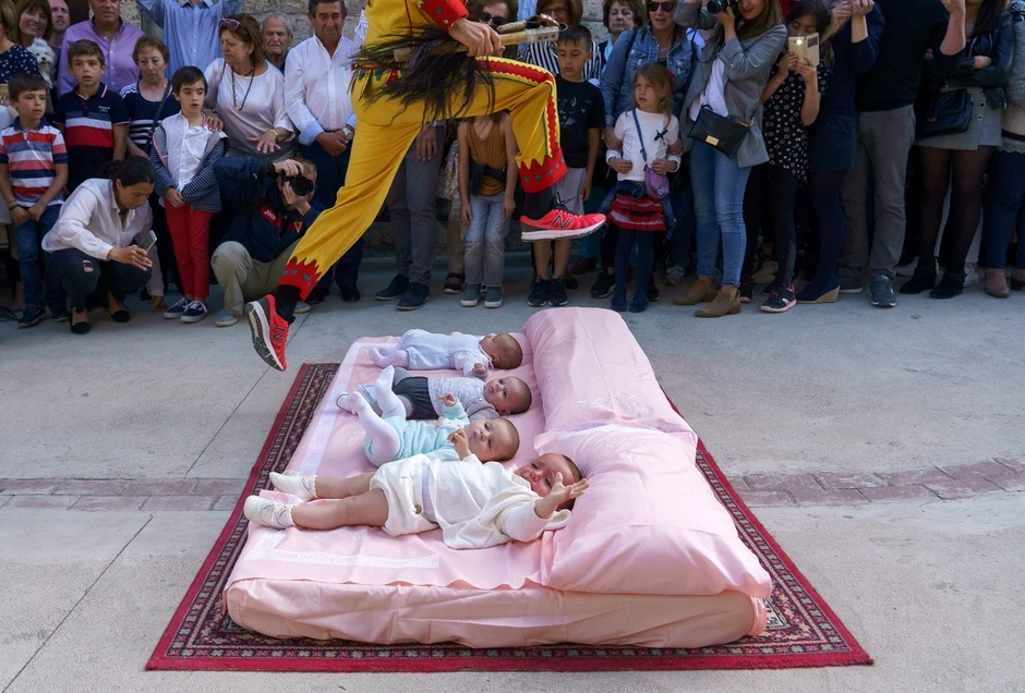 Čovek maskiran u đavola – poznat kao “Kolačo” preskakao je juče bebe u okviru drevnog španskog religioznog festivala namenjenog teranju zlih duhova. “El salto del Kolačo” – odnosno Kolačov skok, odigrava se svake godine u selu Kastriljo de Mursija, blizu Burgosa na severu Španije.