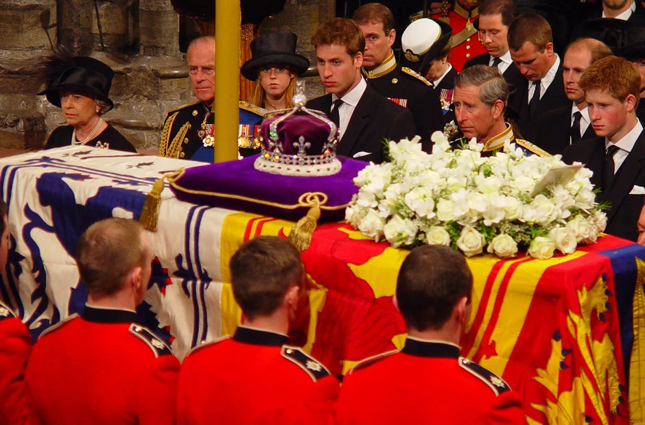 Okupljeni su plakali dok je kovčeg prolazio na 47-minutnom putovanju kroz London do Vestminsterske opatije, ogrnut kraljevskom zastavom i tri bela venca. Na njemu je bilo i pismo dvanaestogodišnjeg princa Harija upućeno "mami“.