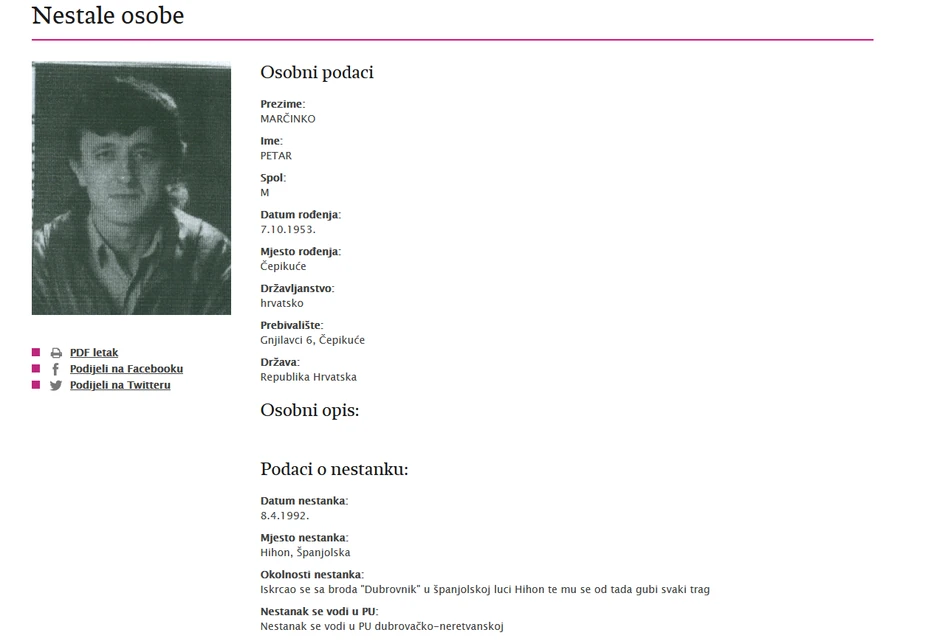 Marčinko se već 30 godina vodi u Nacionalnom registru nestalih lica, uz napomenu da se 1992. godine iskrcao sa broda „Dubrovnik” u luci Hihon u Biskajskom zalivu. Ali mornaru se gubi svaki trag po dolasku u provinciju Asturija.