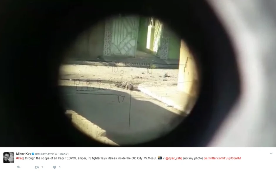 Prema informaciji televizije, "snajperisti DAEŠ-a su zauzeli pozicije na zgradama u područjima Mosula i otvaraju vatru na pozicije vladinih snaga". Komanda DAEŠ-a je odlučila da iskoristi i žene-snajperiste nakon što su izgubili većinu snajperista za vreme operacije iračke vojske u zapadnom Mosulu, naveo je Mosul.