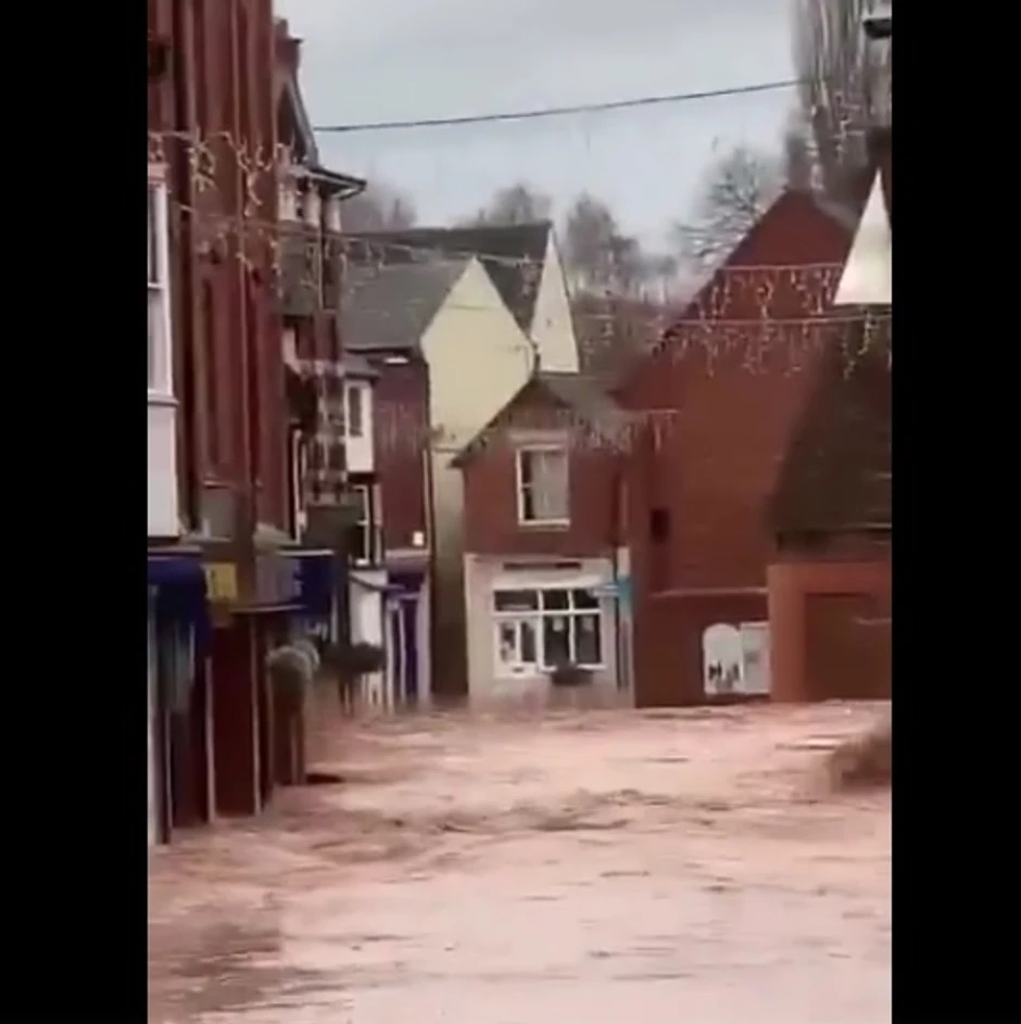 Dramatični trenutak je snimljen kad je voda ušla u centar grada Tenberi Velsa u Vusterširu nakon što je obližnji potok Kajr Bruk preplavio i izazvao rušenje zida za zaštitu od poplava usled oluje Bert.