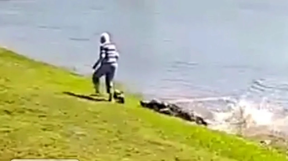 Može se videti kako šeta duž jezera sa svojim psom kada aligator ispliva na površinu, a zatim nasrće na njih.