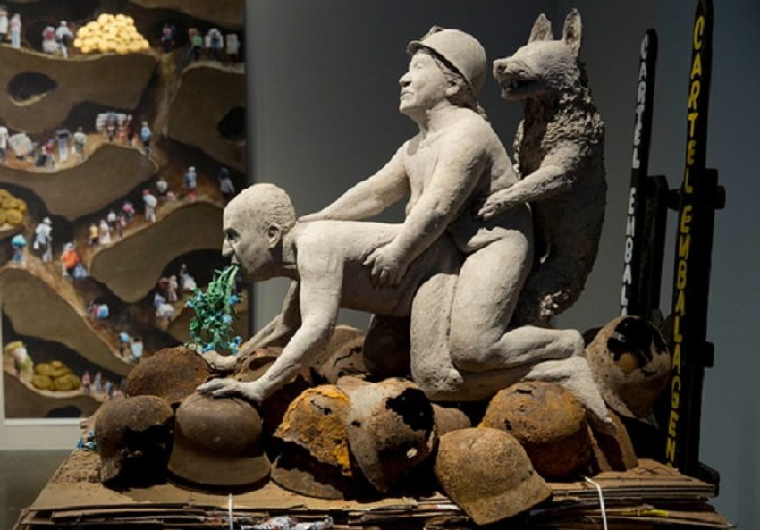 Kontroverzna skultpura prikazuje nemačkog ovčara koji sodomizuje bolivijsku feministkinju i vođu radničkog pokreta Domitilu Čungaru, koja zauzvrat sodomizuje španskog kralja, koji povraća po gomili nacističkih šlemova. Umetnost? Procenu ostavljamo kritičarima.