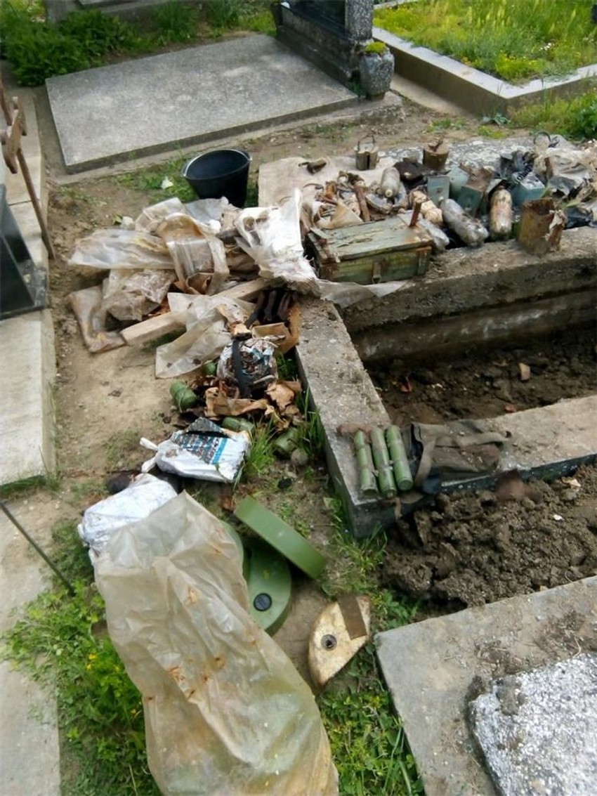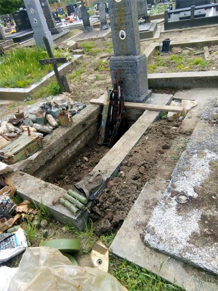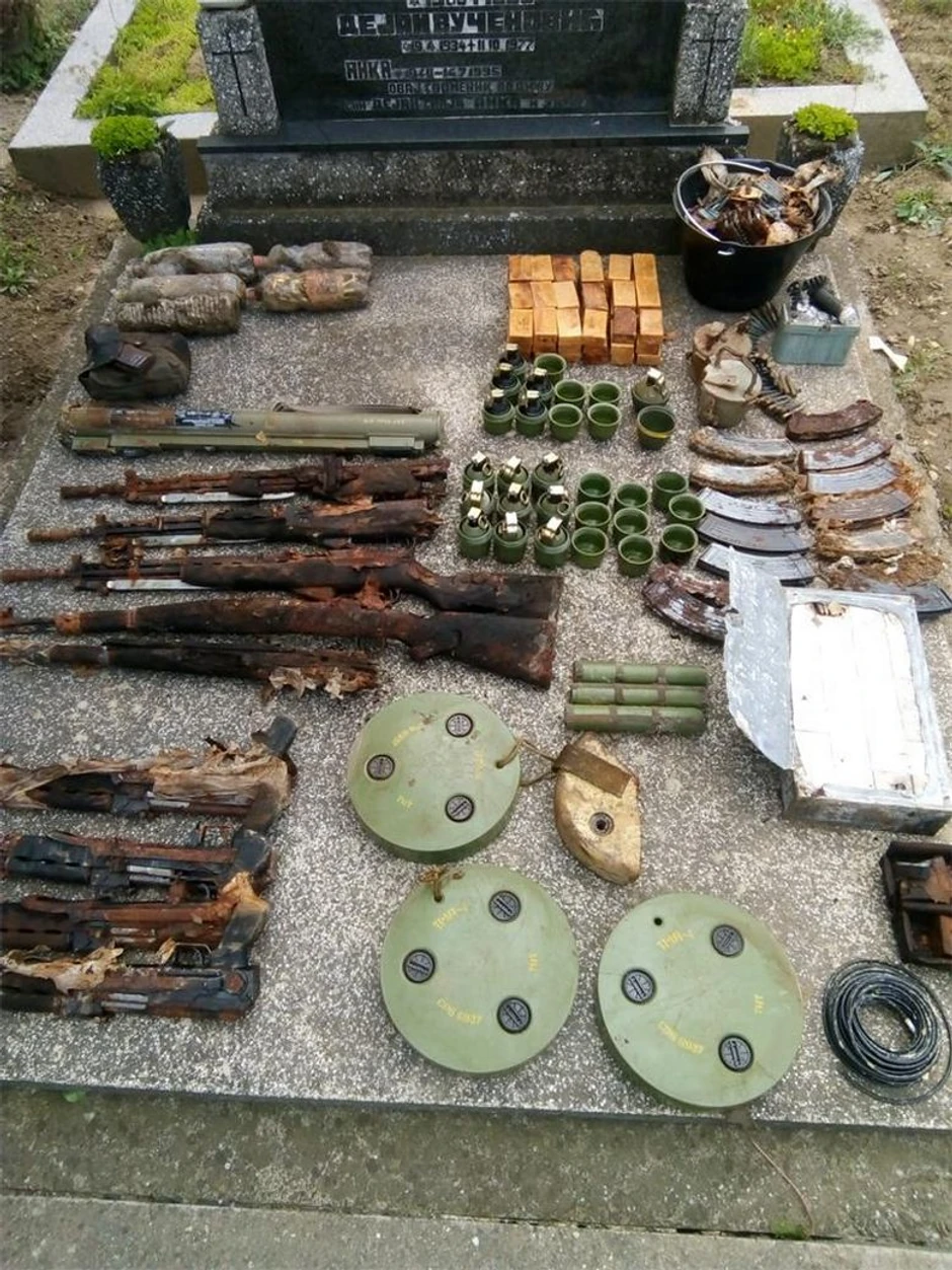 U grobnici su pronađena četiri kalašnjikova, tri poluautomatske puške, dve puške M-48, ručni raketni bacač, 17 ručnih bombi, 36 komada vojnog eksploziva TNT od 200 grama, pola kilograma plastičnog eksploziva, tri protivoklopne mine, devet upaljača za protivoklopne mine, 20 metara sporogorećeg štapina, nekoliko hiljada komada različite municije, uređaj za otkrivanje radioaktivnosti i više komada šaržera za automatske i poluautomatske puške.