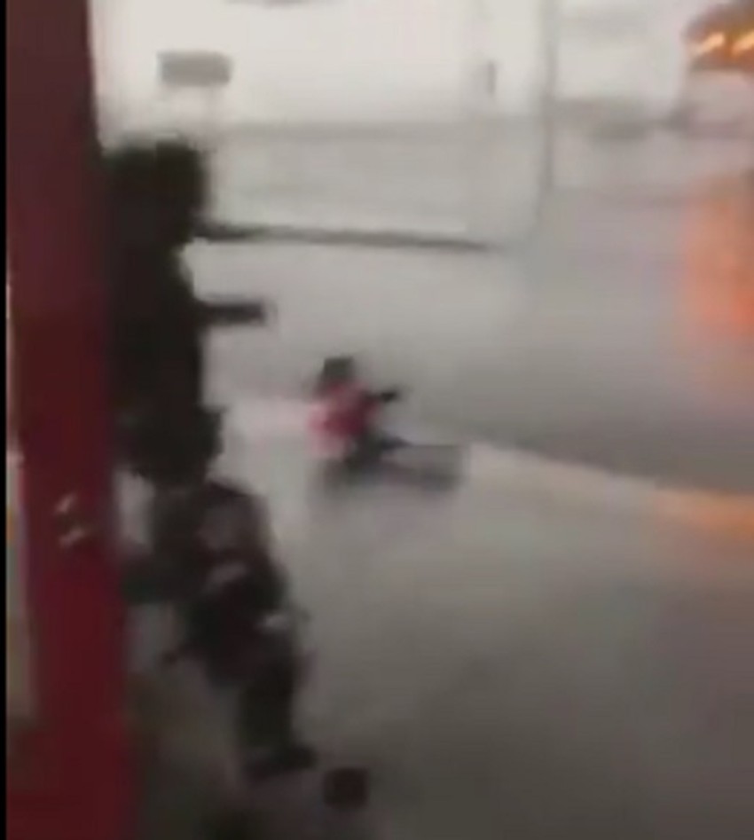 Vidi se da roditelj drži dete, ali kad je talas udario i prelio se preko ograde on ga je zgrabio i potrčao sa njim na bezbedno, dok su ih svega sekunde delile od potencijalno fatalnog incidenta.