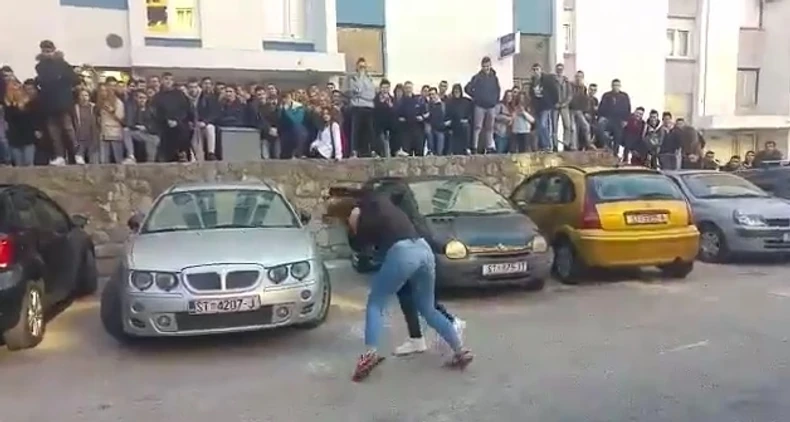 Neverovatni prizori nasilja među učenicima u Splitu od juče se šire društvenim mrežama. Reč je o nekoliko snimaka na kojima se na parkingu u Ličkoj ulici tuku dve učenice dok stotinjak njihovih drugara sve to posmatra i još bučno navija.