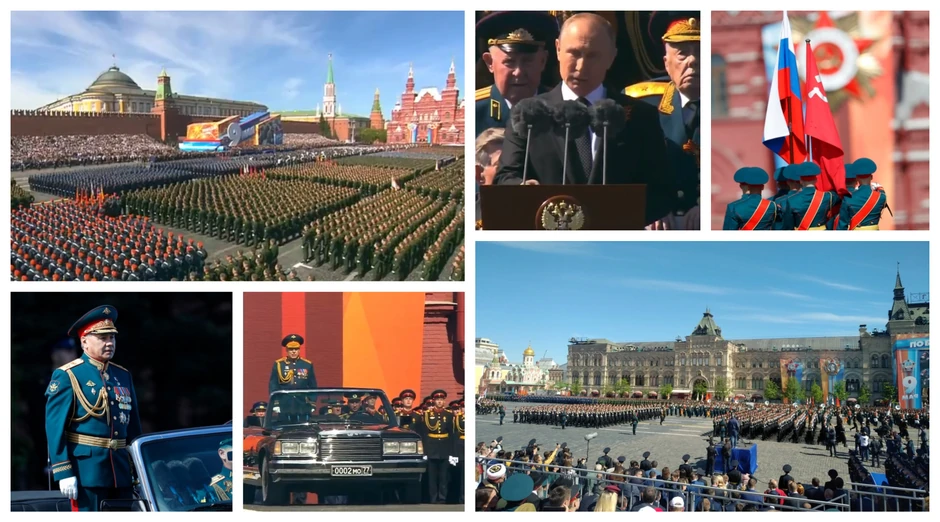 Prvi čovek Rusije potom se obratio okupljenima, čestitavši Dan pobede građanima Rusije, vojnicima i oficirima, rekavši da će je to sveti praznik za čitavu zemlju i da je praznik opštenacionalnog ponosa. Putin je potom rekao da je podvig Sovjetskog saveza u Drugom svetskom ratu došao uz brojne žrtve.
