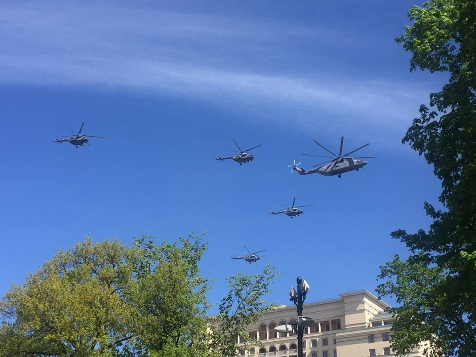 Vazdušni deo parade otvorili su helikopteri Mi-26 sposoban da u vazduh podigne do 20 tona tereta, u pratnji četiri višenamenska helikoptera Mi-8, zatim "Berkuti", helikopteri Mi-28N „Noćni lovac". Šestorka jurišnika Su-25 ukrašava nebo iznad Moskve ruskom trobojkom.