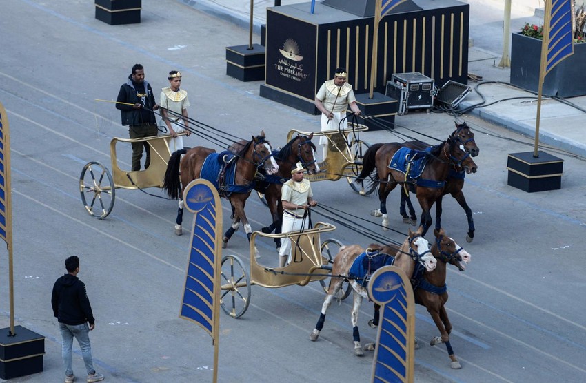Mumije su transportovane u specijalnim klimatizovanim sarkofazima, na kamionima ukrašenim krilima u faraonskim obeležjima, a egipatska artiljerija je ispalila 21 počasni plotun povodom ovog događaja nazvanog Zlatna parada.