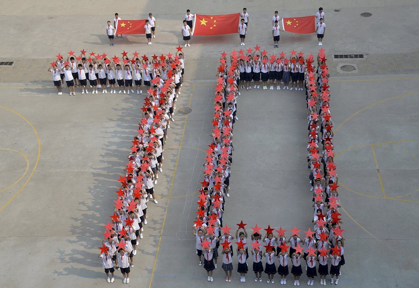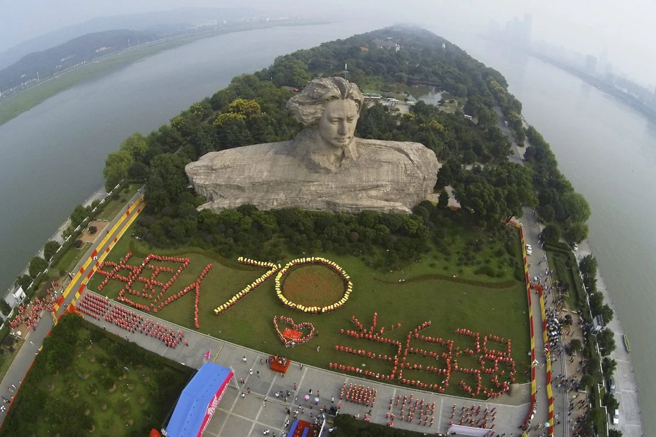 Ispred statue Mao Cedunga iz mlađih dana, Kinezi su formirali veliki broj 70, uz tekst "Kineski narod će težiti ka tome da postane još jači".