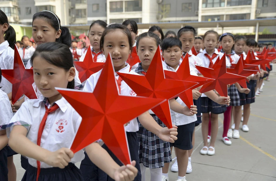 Učenici osnovne škole u kineskom gradu Handanu vežbaju koreografiju, noseći upečatljive crvene zvezde.