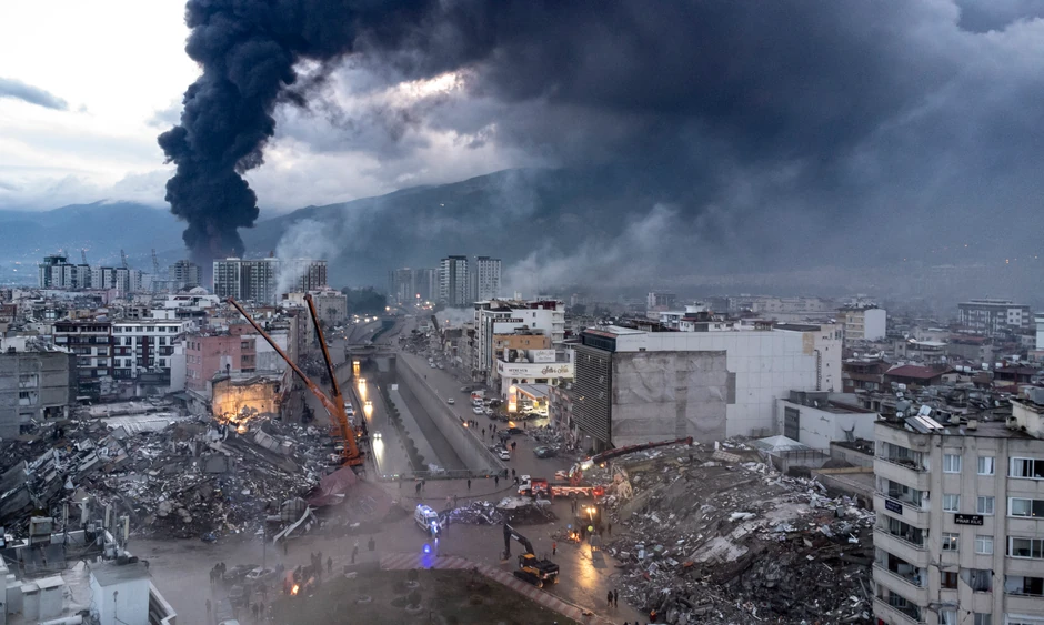 Karikatura objavljena na Tviteru kao "ilustracija dana" prikazuje srušene i oštećene zgrade, prevrnuti automobil i brdo ruševina.