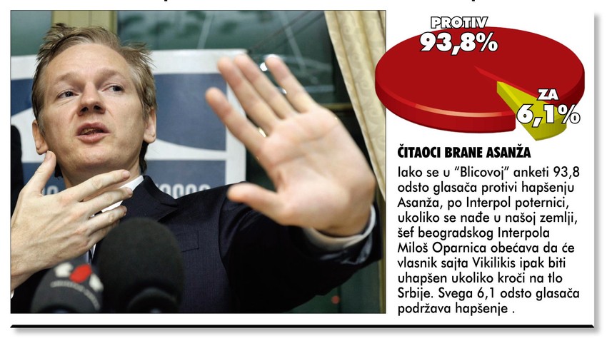 Srpska policija uhapsiće Džulijana Asanža, osnivača vebsajta Vikiliks ukoliko se pojavi na teritoriji Srbije, izjavio je za “Blic” Miloš Oparnica, šef beogradske kancelarije Interpola nakon raspisivanja crvene poternice za kontroverznim novinarom zbog objavljivanja poverljivih dokumenata koji su otkrili mnoge neugodne tajne svetske diplomatije.