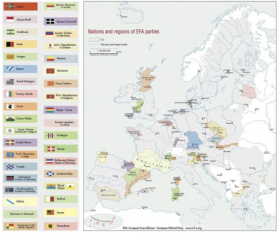 Fotografija mape pokazuje sva područja koje žele samostalnost, počevši od španskih regija Baskije i Katalonije, zatim Savojskog regiona u Francuskoj, pa sve do već pomenute Škotske.