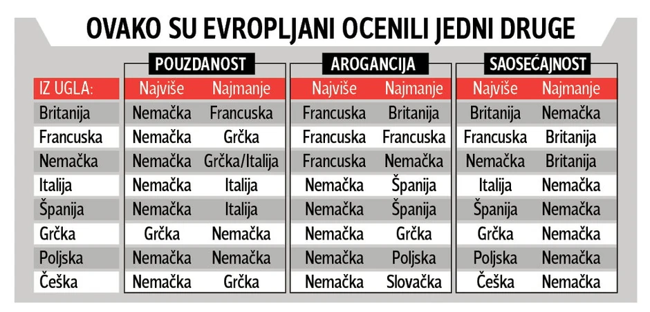 Za Evropljane su Nemci ljudi od poverenja, ali ih zato smatraju arogantnim i bezosećajnim. S druge strane, sve evropske nacije najlepše mišljenje imaju o sebi.