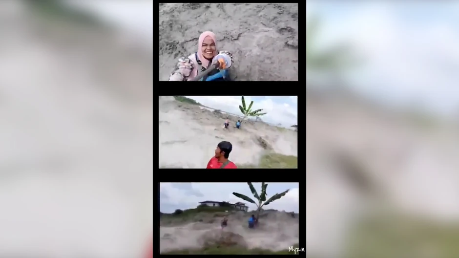 Na snimku se vidi kako su se popeli na uzvišenje, dok mladić koji se osigurao gumenim prslukom udara u palmu. Za to vreme žena ga snima, a dvoje mladića penje se na brdašce dok jedan od njih selfi štapom snima. Ubrzo je stigla voda i "pokupila" ih sve.