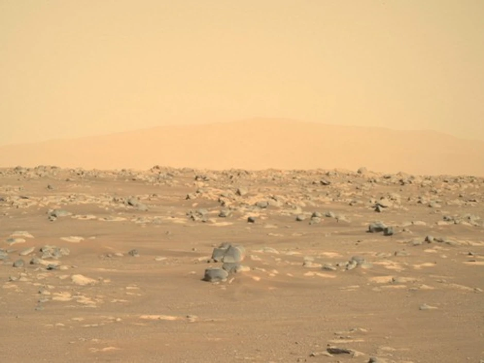 Slika prikazuje pustu oblast sa geološkim formacijama, uključujući stenu sa usecima od vetra i ivicu kratera Jezero, gđe se rover spustio prošle sedmice.