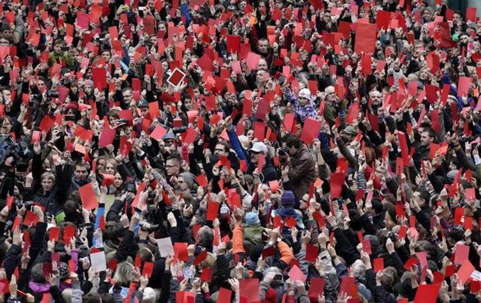 Uz transparente "Nismo ruska kolonija" ili "Stidim se svog predsednika" pokazuju poput fudbalskih sudija predsedniku Zemanu crvene kartone uz poruku ga se stide zbog njegovih proruskih stavova, ignorisanja ljudskih prava u svetu, recimo u Kini i postavljanja u spoljnoj politici iznad prava i sloboda privrednih interesa.