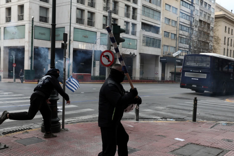 Grčki portal Grik riporter preneo je da su se sa policijom sukobili učesnici protesta koji su nosili biciklističke kacige i zastave Grčke, dok su drugi grčki mediji preneli da se radi o članovima ekstremno desničarske organizacije "Zlatna zora", koji su takođe prisustvovali protestu na trgu Sintagma u centru Atine.