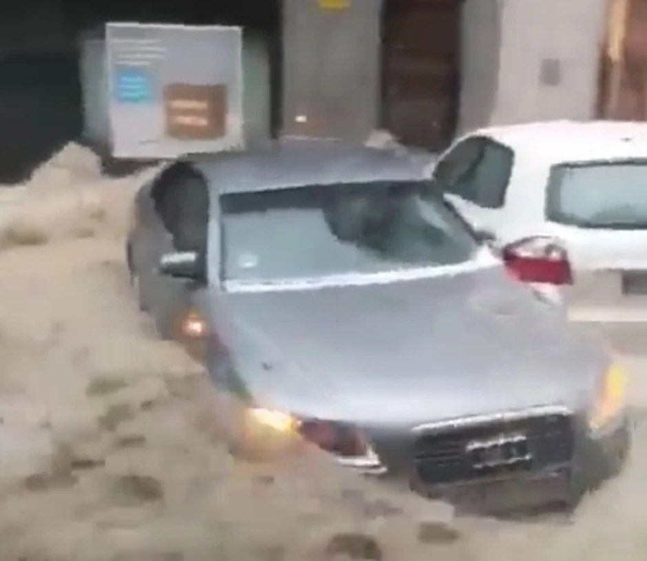 Na video snimcima koji su se pojavili na društvenim mrežama vidi se kako bujice vode guraju kola, a navodi se da je oštećeno ukupno 50 vozila, prenosi Oliv pres.