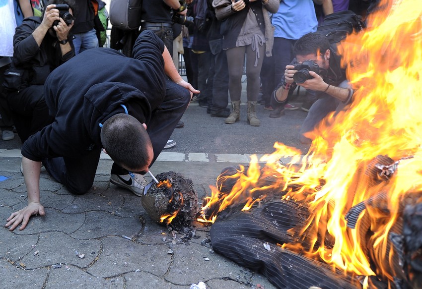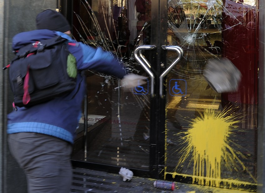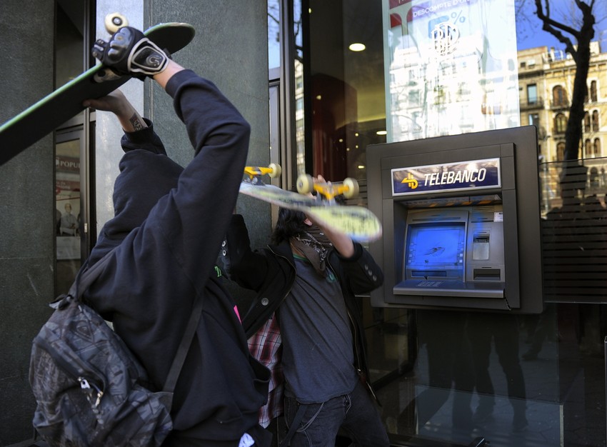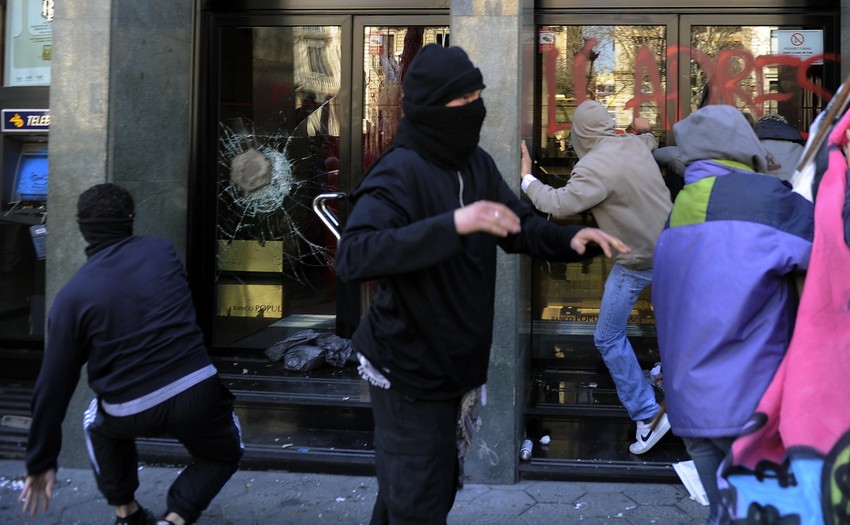 Ta grupa je tokom protesta razbijala izloge banaka, dok se požar podmetnut u jedan od kontejnera proširio na nekoliko automobila.