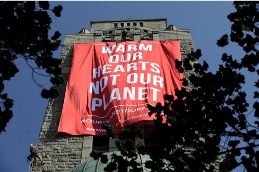 Organizacija za zaštitu životne sredine "Grinpis" postavila je danas na tornju luteranske crkve Kalio u Helsinskiju ogroman transparent o borbi protiv klimatskih promena.