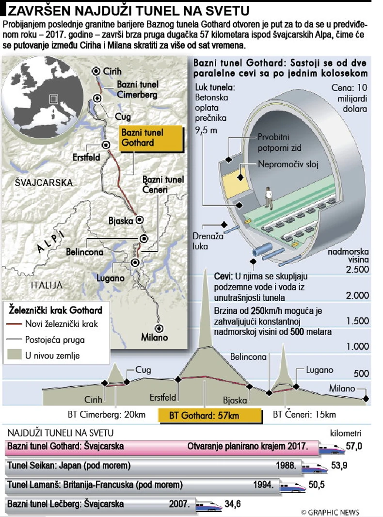 gužve na putevima kad se tunel pusti u rad 2017. godine. Putnici će moći da prevale rastojanje između Milana i Ciriha za manje od tri sata i nastave dalje za Nemačku, čime se putovanje skraćuje sat vremena. Ovaj železnički tunel koji je koštao sedam milijardi evra posledica je velike zabrinutosti javnosti koja se uplašila zagađenja Alpa zbog pojačanog drumskog saobraćaja iz susednih država. Posle 15 godina građevinskih radova, bušilica prečnika 9,5 metara prokopala je preostalih metar i po stena i tako spojila dva kraja tunela ispod planine na dubini od 2.000 metara. Ovaj spektakularni događaj, kome je prisustvovalo oko 200 visokih zvaničnika u samom tunelu, uživo je prenosila švajcarska televizija.