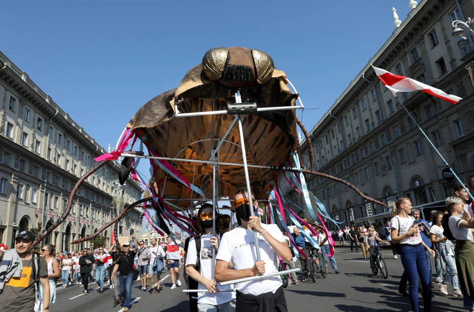 Model bubašvabe dug tri metra, koji su protestanti nosili, simbolizuje Lukašenka, koga u narodu zovu Bubašvaba.