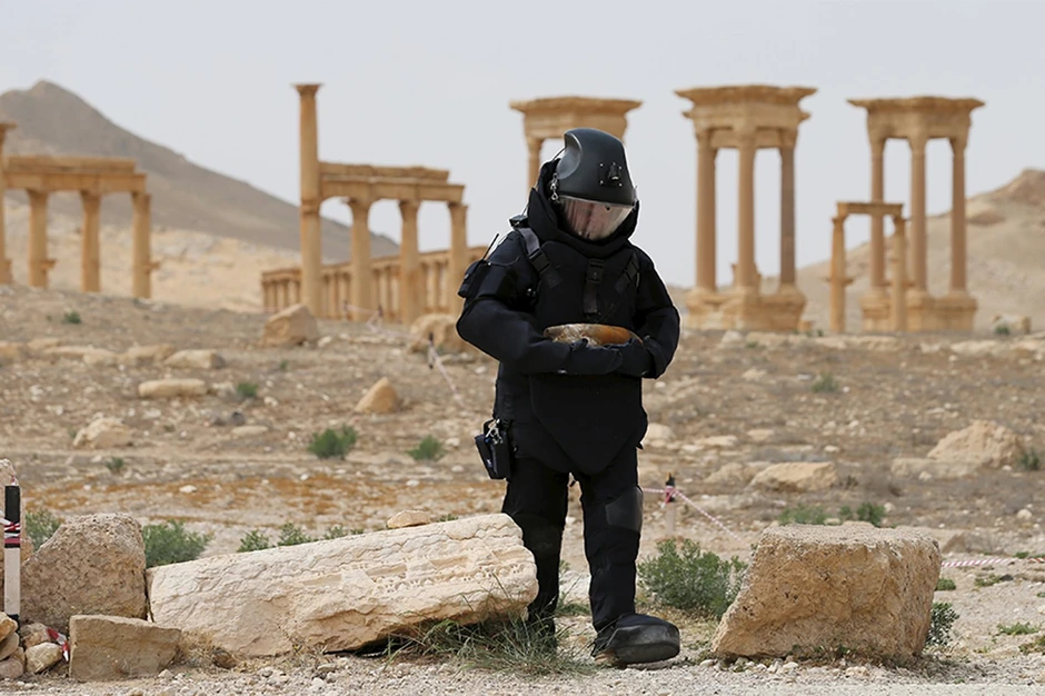 Oni čiste ulice Palmire od zaostalih bombi i u mnogim ulicama se mogu videti natpisi “Nema mina”.