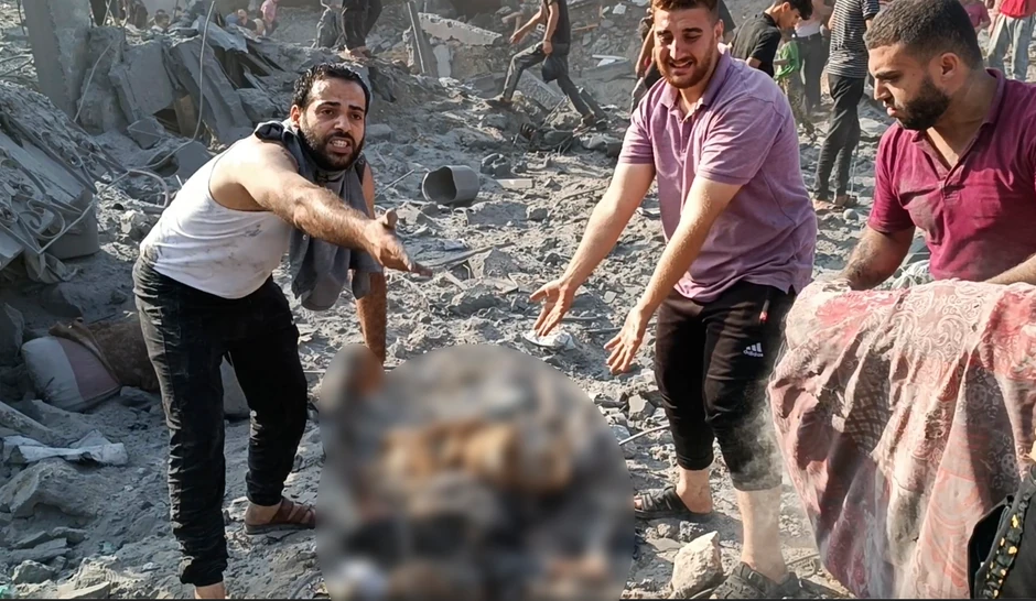 Prizori sa lica mesta pokazuju veliki krater među ruševinama i oštećene zgrade. Vidi se kako Palestinci i spasioci pokušavaju da pronađu žrtve, a neki rukama odnose krš.