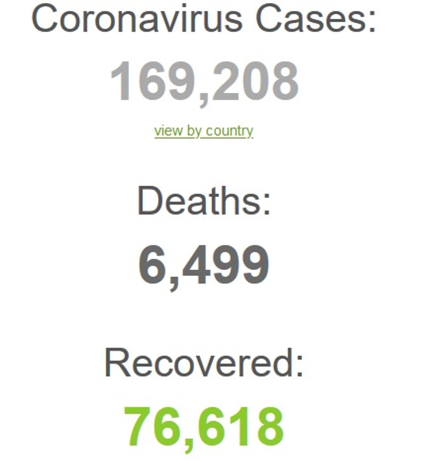 Broj zaraženih od korona virusa Kovid-19 premašio je 169.000, a broj preminulih 6.499 osoba, pokazuju podaci sa sajta Worldometers. Istovremeno, više od 76.500 ljudi se oporavilo od korona virusa. Pored Italije, nova žarišta na tlu Evrope su Francuska i Španija.