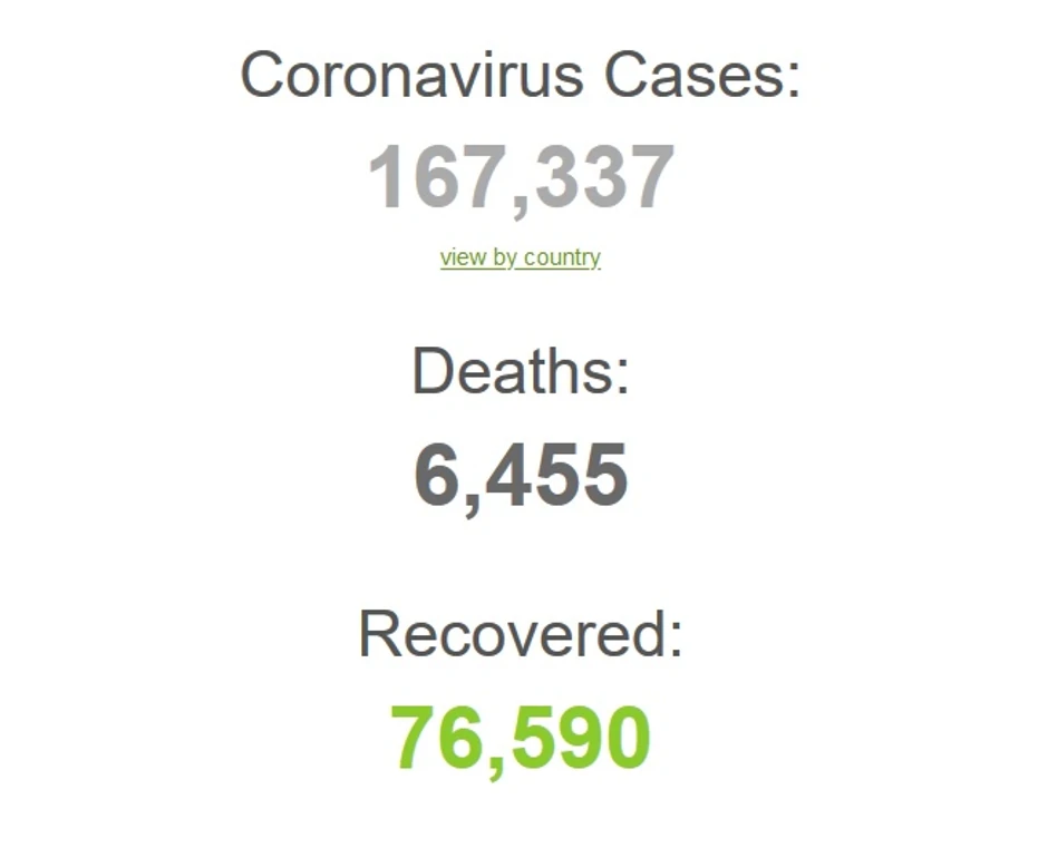Prema podacima koje je jutros objavio Worldometers.info, ukupan broj žaraženih je 167.337, s tim da je 75.424 aktivnih slučajeva (pacijenti koji imaju virus) i 81.779 zatvorenih slučajeva (pacijenti koji su se ozdravili ili preminuli).