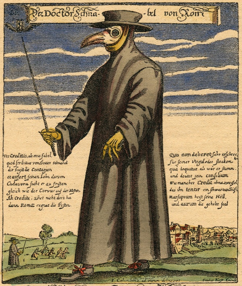 U to vreme, lekari nisu imali zaštitnu opremu kakva postoji danas, a na slikama se često može videti da su nosili tamne ogrtače, koji su ih pokrivali od glave do pete, okrugao šešir i rukavice s kandžama. Ipak, najstrašnija je bila maska, nalik na pticu, koja je tada bila najbolji mogući način da se lekar zaštiti od mijazma, štetnog oblika „lošeg vazduha“.