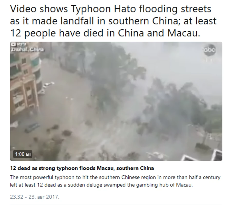 Smrtonosni bilans tajfuna "Hato", najsnažnije oluje koja u više od pola veka pogodila južni kineski region oko Hong Konga, popeo se na 16, javlja AFP.