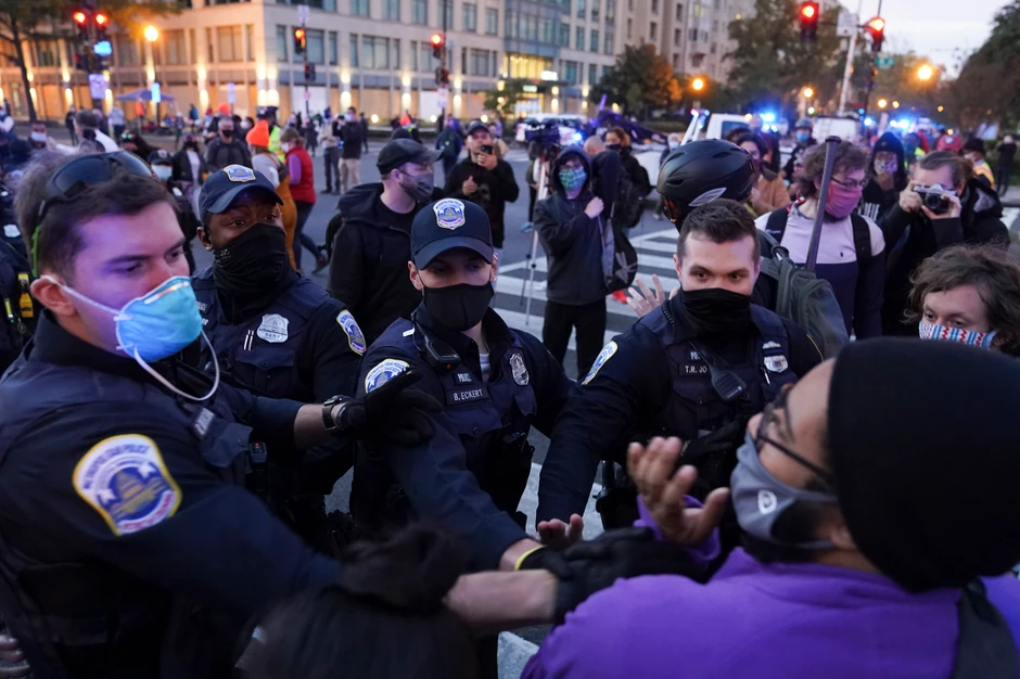 Kako list dodaje, pre zatvaranja birališta u Vašingtonu, grupa demonstranata sukobila se sa policijom u blizini takozvanog trga "Životi crnaca su važni", a jedna osoba je uhapšena.