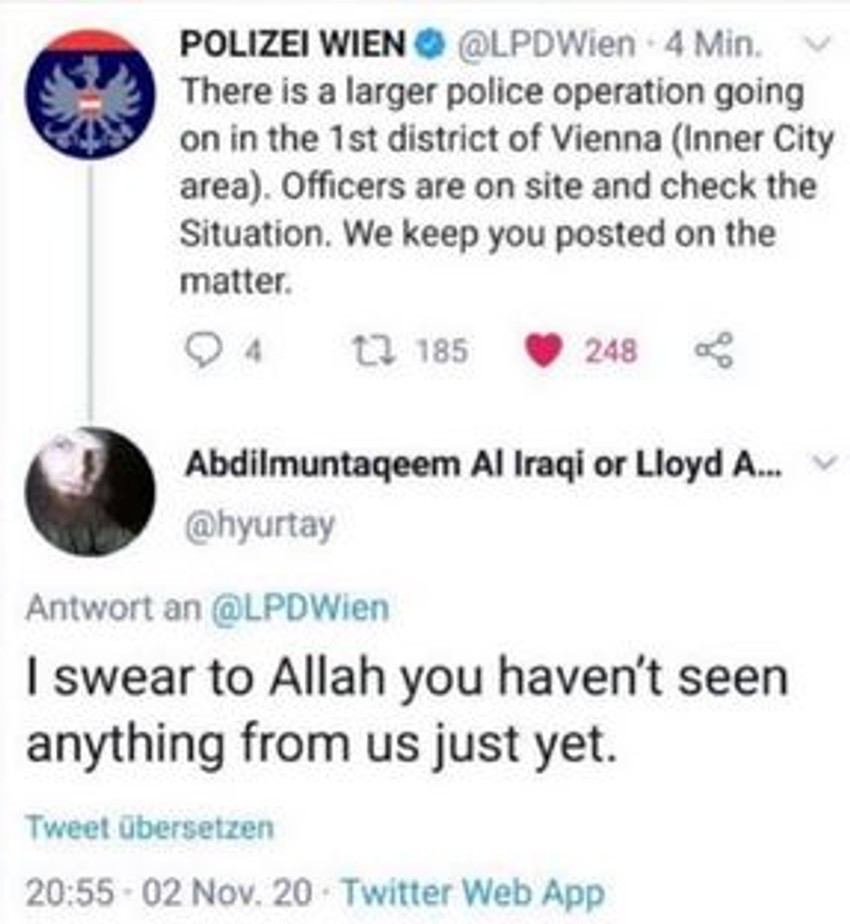 Na zvaničnom Tviter nalogu bečke policije koja je objavom upozorila građane na teroristički napad koji se odvijao sinoć u austrijskoj prestonici pojavile su se zastrašujuće pretnje neidentifikovanog islamiste.